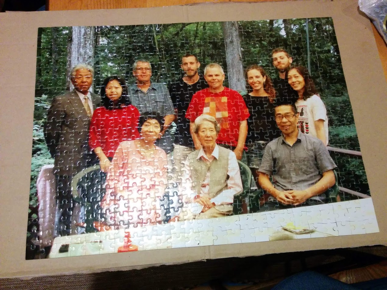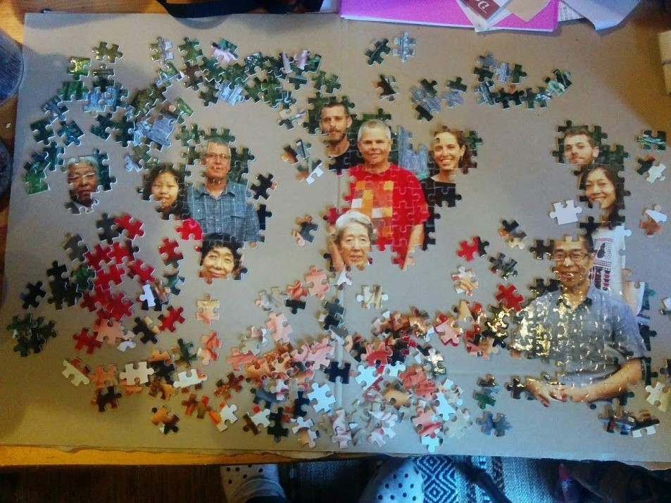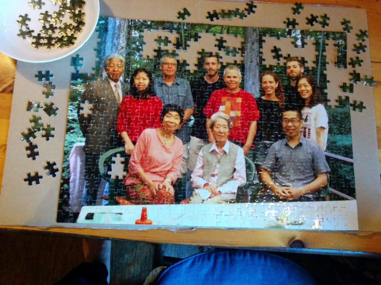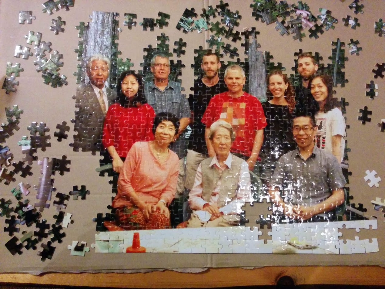 思い出づくり 昨秋のある日、イスラエルに住む旧友オフェルから、文字通り小さな小包が届いた。開けてみると、ごちゃ混ぜになったジグソーパズルのピースだった。彼は昨夏8月、60歳を迎えた記念に、妻と20代の3人の息子、娘たちを連れて、2週間にわたって広島から京都、高山をまわり、山中湖に二泊滞在したのだが、その折に撮影したわたしたち家族との総勢11名の集合写真が、どうやらパズルの完成図になるらしかった。「長い冬の合間に、挑戦してみてください」と書かれたカードが添付されていた。が、パズルに無縁のわたしは、冬の到来をも押しやって、しばらくは包みをながめるだけだった。 それが、やはり真冬になってみると、家の中で過ごす時間が多くなり、積雪もないので、思わず「ジグソーパズル、やってみようかしら」という気になった。 それからがたいへんだった。まず、一旦広げたパズルは、簡単には片づけられないということがわかり、出来上がりの大きさも想定できず、制作場所を求めてうろうろした。やがて場所は決まったが、各ピースはほぼ同形で、色の違いが区別しにくく、見本写真を横目に手も足も出ず、わずか数個をはめて初日が終わった。 2日目、早々に諦めようかと思ったが、今さら店じまいも悔しいので、つづけることにした。周縁ピースは異形でやり易そうだが、どれも樹木の色なので区別ができず、まず、11人の顔からはじめると、意外な発見があった。オフェルの祖父母はリトアニアの出自ときいていたが、彼ら家族5人とわたしたち家族6人(母、夫婦、長男夫婦、孫ひとり)の肌の色はほぼ同じで、頬や腕、首部分のピースには、いたくまどわされた。彼らが黄色人種なのか? わたしたちが白人種なのか? 11人しかいないのに、えっ、唇が12個もあるのは、何故か? そのうちの1個は唇ではなく、うちの息子の右手親指と人差し指であることが判明した。 ウディ(オフェルの長男)の髪だと思ってはめたピースは、実はガル(次男)のあごヒゲだった。まったく、どうしてこんな同色同材のヒゲ生やすの! ガル、まぎらわしいよと、ぶつぶつ。 アミット(オフェルの妻)の左目が、なかなか見当たらない。と諦めたら、エリ(彼らの娘)の左目と、入れ違っていた。母子だもの、やっぱり似てるねと、ぶつぶつ。 あの夏の日、東京に行く彼らを見送る直前、11人それぞれがこういう衣服で、こういう仕草で、こうした位置に立っていたことに、今さらながら気づいて懐かしく、いつの間にか、ひとりひとりに声をかけている。オフェル、両手を組んで何を考えていたの? ガル兄弟、黒の無地Tシャツじゃなくて、チェックにしてもらいたかったなあと、ぶつぶつ。 それにしても、エリのカーリーヘア、樹木にからまるツタと見まちがえるところだった。写真撮影数日後に中耳炎になって寝込んだうちの孫は、この時はまだこんなに元気だったのにねと、ぶつぶつ。 ここまで約5時間、3日間もかかった。そして11人の顔ができあがった瞬間、まるで命が吹き込まれたみたいに、全員の目が一斉に笑った! わーお! すごい! まちがいなくみんな生きている。 いよいよ佳境に入ったつもりの4日目だが、早々にスタック状態になった。ピースのヒントもなく、何をどこにはめても、場違いだった。困った。こういうときは、一旦離れることにして、台所に立ったが、年明けから同居しはじめた93歳の母が、何を思ったのか、パズルの前にすわってピースをにぎっているではないか。しばらく見ていたら、はめたり、外したりもしている。 そばに寄ると、できたばかりのオフェルの髪の毛がくずれている。いやあ、やめてくれ。とんでもないことになりそうだった。苦戦している娘を見て、助けようとしたのかもしれないが、それはありがた迷惑というもの、母には気の毒だが、席を外してもらった。 こうなったら、自力で再開するしかない。しばらく、シャツの見頃と椅子のピースや樹木の緑が入れ違ったりしたが、それらはむしろ自信のある部分だった。まさかの思い違い、カン違いが連続した。もともと、完成図のない生身の人生途上では、人は正義と正確さとを混同し、おそらく間違いに気づかずにすすんでしまうにちがいない。 パズルが構築されていく一方で、自信が次々に崩されていく。ほぼ同時進行なのが、ショックというより、刺激的だった。絶対自信があったピースが、間違いだったなんて。見当たらないピースはきっと、床に落ちたか、紛失したか、もしや最初から欠番だったか? などと安易に疑ったりもするが、実はどっこい、背景色にすまして紛れていたりする。 完成したのは、4日目の夕方。すべてが正確に、絶対の定位置に納まった痛快の一瞬! のべ8時間で再築した500ピースの夏の日が、目の前に広がった。11人は今、専用額に行儀よく納まって居間の壁で笑っている。可笑しなことに、彼らは、ときに真顔になったりもして、わたしをおどろかせる。 |