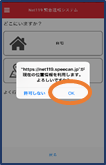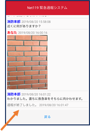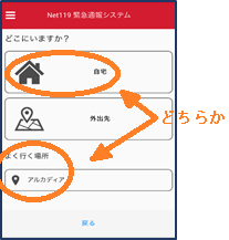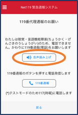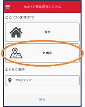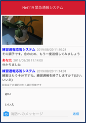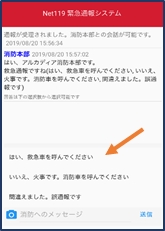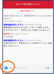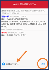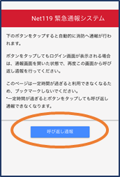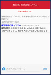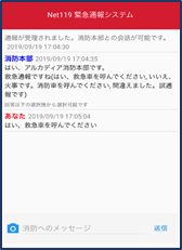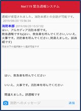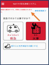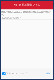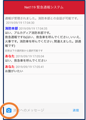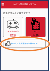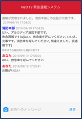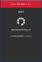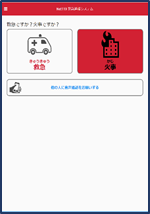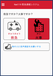 ① 【自宅・よく行く場所からの通報】 ホーム画面に追加したアイコンをタップし通報画面を表示します。 ![]() (1) 「救急」「火事」のいずれかを選択します。 ![]() ※ 「位置情報の利用を許可しますか?」などと表示された場合「OK」や「許可」を押します。 ![]() (2) 「自宅」または事前に登録した「よく行く場所」を選択します。 ![]() (3) 救護対象者、通報時に伝えたいこと(任意)を入力します。 ![]() (4) 「通報する」のボタンをタップして通報します。 ![]() (5) 通報が受け付けられるまで、呼び出し中の画面が表示されます。 ![]() (6) 通報が受け付けられると、チャット画面に切り替わります。 ▲ ページ上部へ戻る ▲ ② 【外出先からの通報】 ホーム画面に追加したアイコンをタップし通報画面を表示します。 ![]() (1) 「救急」「火事」のいずれかを選択します。 ![]() ※ 「位置情報の利用を許可しますか?」などと表示された場合「OK」や「許可」を押します。 ![]() (2) 「外出先」を選択します。 ![]() (3) 救護対象者を選択します。 位置情報がずれているときは、地図上にタッチして修正できます。 ![]() (4) 「通報する」のボタンをタップして通報します。 ![]() (5) 通報が受け付けられるまで、呼び出し中の画面が表示されます。 ![]() (6) 通報が受け付けられると、チャット画面に切り替わります。 ▲ ページ上部へ戻る ▲ ③ 【チャット】 通報が受け付けられるとチャット画面に切り替わり、文字による双方向の会話ができるようになります。 基本的には消防本部からの質問に通報者が答えるスタイルで会話を行います。 ![]() (1) 通報を受け付けた消防本部から呼びかけが入ります。 選択肢がある場合、タッチして回答できます。 ![]() (2) 選択した回答が送信されます。 ![]() (3) 任意のメッセージを送りたい場合は矢印部に入力し、送信を押します。 ![]() (4) 入力したメッセージが送信されます。 ![]() (5) カメラのマークから、写真を撮影し、送信することもできます。 ![]() (6) 「通報が終了しました。」というメッセージが表示されたら、安全な場所で待機します。 ▲ ページ上部へ戻る ▲ ④ 【代理通報】 近くにいる人に、代理通報を頼むこともできます。 ![]() (1) 通報画面で「他の人に音声通話をお願いする」を選択します。 ![]() (2) 「音声読み上げ」をタッチすると、「わたしは聴覚・言語機能障害のため、電話できません。かわりに119番通報をお願いします」というメッセージが読み上げられます。 ▲ ページ上部へ戻る ▲ ⑤ 【練習通報】 実際に消防本部に通報されない練習通報をすることもできます。通報方法は本番と同じです。 ![]() (1) 通報画面左上をタッチし、メニューバーを開きます。 ![]() (2) 「通報を練習する」を選択します。 ![]() (3) 画面上部に「通報の練習中です。実際には通報されません」と表示された通報画面になります。 ![]() (4) チャット画面では、システムが自動で返信します。 ![]() (5) 本番と同じように、カメラアイコンから写真を送ることもできます。 ![]() (6) 3回やり取りを行うと、「練習通報を終了しますか?」と聞かれます。 ![]() (7) 「はい」を選択すると、練習通報が終了します。 「戻る」を押します。 ![]() (8) 本番の通報画面に戻ります。 ▲ ページ上部へ戻る ▲ ⑥ 【呼び返し通報】 一度通報が終了した後、消防側から呼び返しメールが届くことがあります。 ![]() (1) 呼び返しメール内のURLを開きます。 ![]() (2) 「呼び返し通報」を押します。 ![]() (3) 呼び返し通報が受け付けられるまで、呼び出し中の画面が表示されます。 ![]() (4) その後、通常の通報と同じようにチャット画面に切り替わります。 ▲ ページ上部へ戻る ▲ |