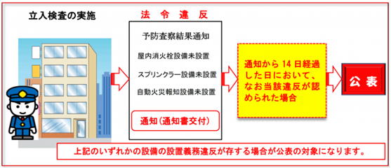 建物を利用する方自らが建物の危険性に関する情報を入手し、その建物を安心して利用できるよう、消防機関が立ち入り検査の際に確認した重大な消防法令違反のある建物を公表する制度です。