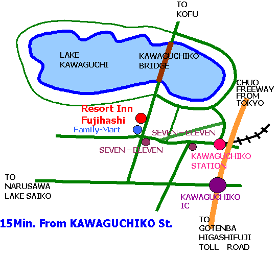 Inn Fujihashi is 15min. from Kawaguchiko Station by walk. It is 5 minutes in taxi use. |