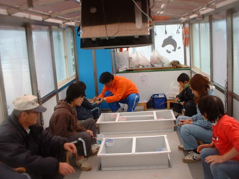 | 2006年山中湖氷上わかさぎ穴釣りの様子です。 |