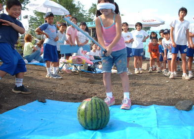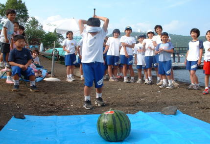 明日(7月22日)、最終日を向かえての山中湖畔サイクリング後のスイカ割り大会の風景でした。