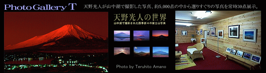 天野光人が山中湖で撮影した写真、約5,000点の中から選りすぐりの写真を常時30点展示。またご希望の方には写真をお譲りいたします。 その写真の一部は、山中湖のパンフレットにも使われ、また紅富士の湯にも展示されています。