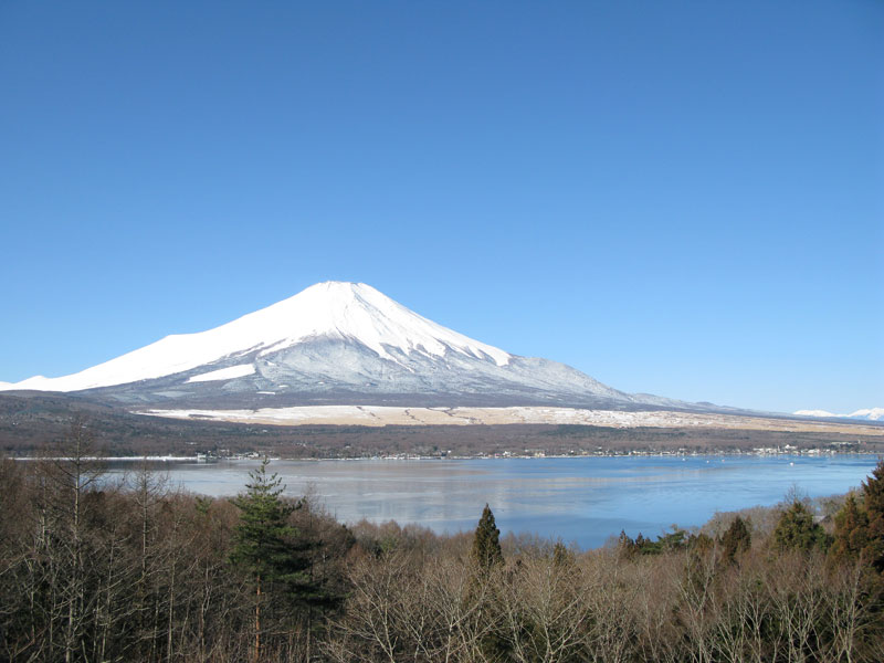 2008 3/6 8:23am 今朝は冷え込みましたが、ご覧の通り雲一つないピカピカの富士山です。樹林帯の雪もきれいです。湖面の氷も一時はほとんど解けてしまいましたが、また薄氷が張っているようです。 |