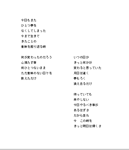 | ある年令に達し、人生の基盤が出来,先が見えてしまうと 若い頃抱いていた夢とのギャップに打ちひしがれることが、 誰でも一度くらいあると思う。夢が大きければ大きいほど、 そのショックは激しく、「俺は一生ここへ勤めて、そこそこ 出世してそれで終わるんだろうな・・・」などとため息をつい ていたりする。若いうちは夢を食べて生きて行けるが、ある 年令以上になると、悲しいかな夢を削りながら生きて行か なくてはならなくなる。 これはそんな人達へのラブレター。そんなに悲観的になら ずに、今出来ることを少しずつでもやっていけば、今日より 明日、明日よりあさってと輝いて行けると思う。 |