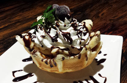 手作りワッフルの器に バナナと、生クリーム、 フローズンブルーベリー、 チョコレートソース。 |